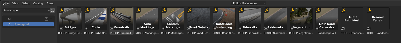 If selected, your Asset Browser should now display the Roadscape generators as so (with more or less stuff in it, depending on the version):